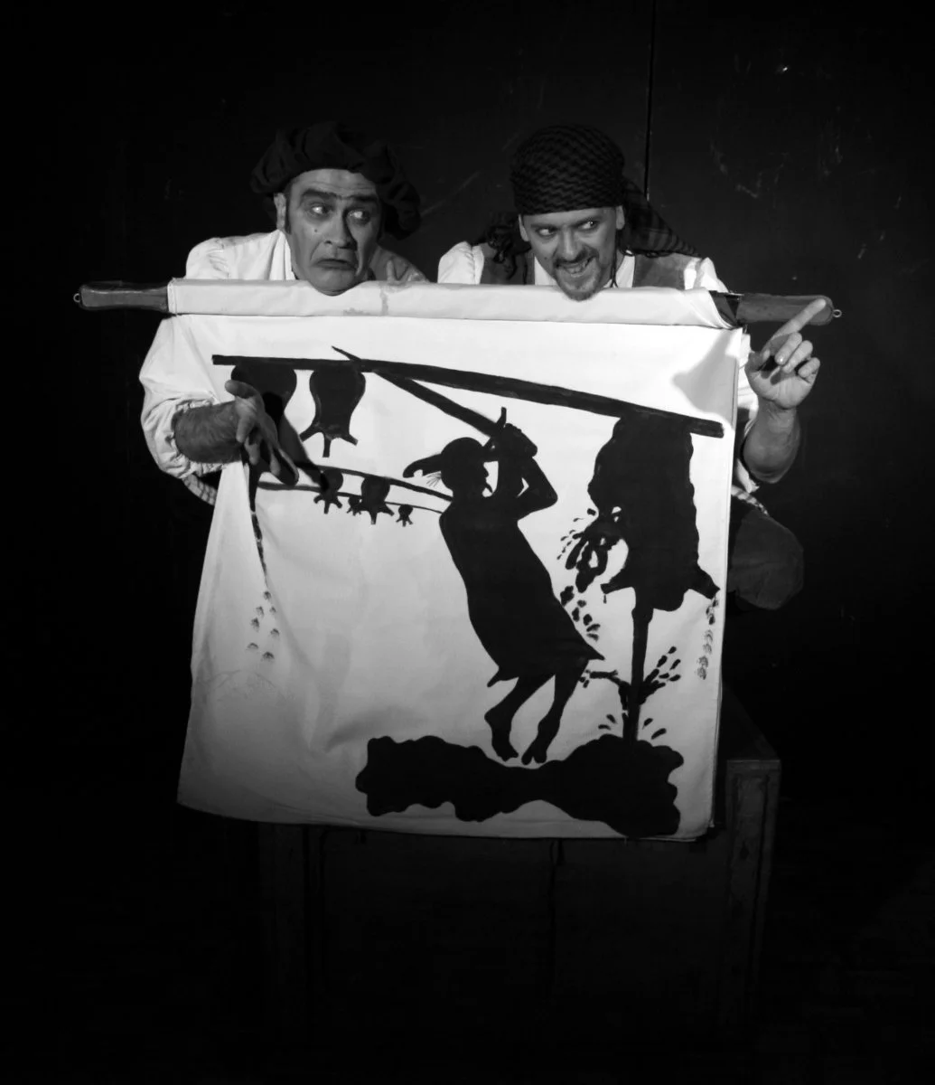 Coscorrón y Ganapán, dos buscavidas, maestros de penurias y hambres, señores de charcos y dormida al raso, con ingenio y picaresca sobreviven el día a día haciéndose pasar por comediantes. Hoy recrean varias escenas del Quijote –los molinos de viento, el “encuentro” con Dulcinea, la Ínsula de Barataria… Pero todo parecido con la obra cervantina será pura y tronchante coincidencia. En resumen, una aproximación a un clásico de la literatura a través del clown, el uso de máscara larvaria y el rap.