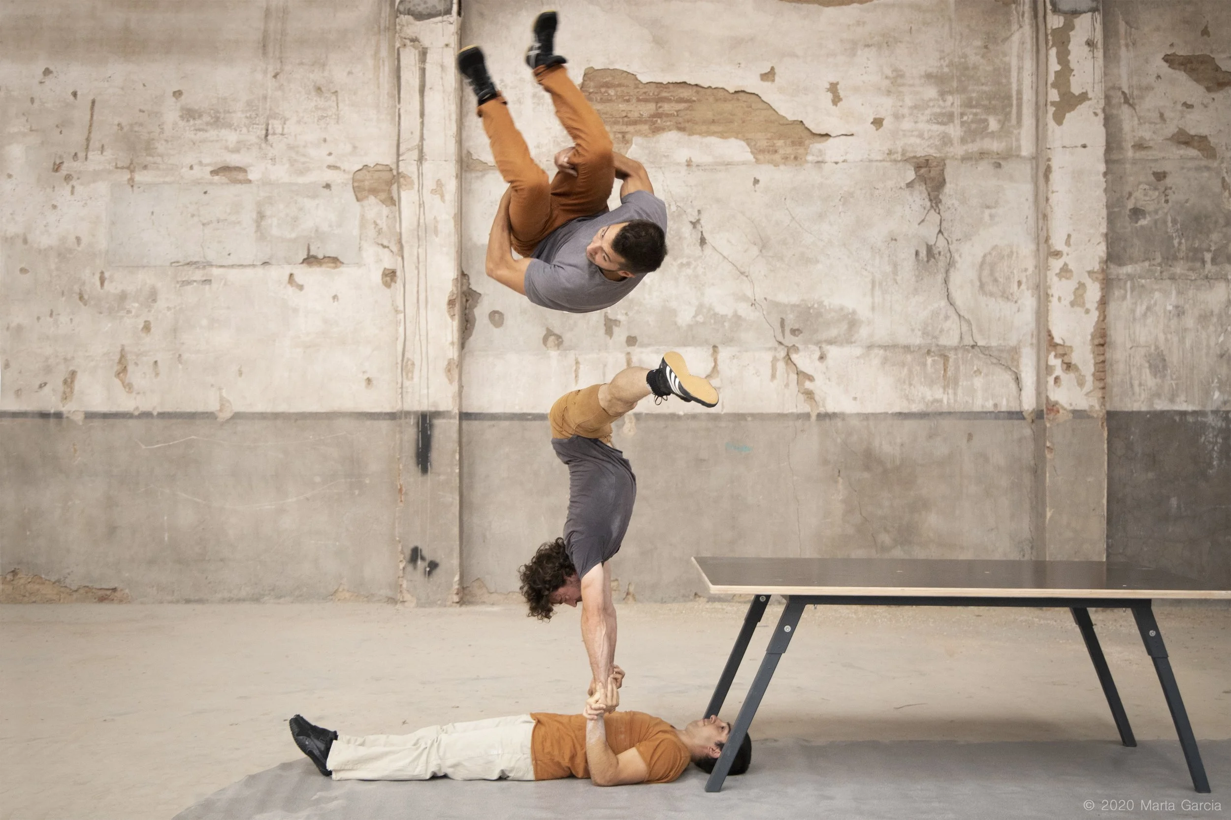 “Un escenario desordenado y los acróbatas llegan tarde. Y el músico, ¿dónde está? Un portor que manda y lo quiere controlar todo aunque nadie le hace caso; un ágil-verticalista desgarbado, juguetón y con mucho ritmo; un acróbata novel, despistado y con poca autoestima, y un músico con delirios de grandeza y recuerdos de un pasado mejor ¡Un espectáculo a ritmo de rock, con acrobacias sobre mesa, verticales, mini-báscula y equilibrios mano a mano en dúo y trío!”.