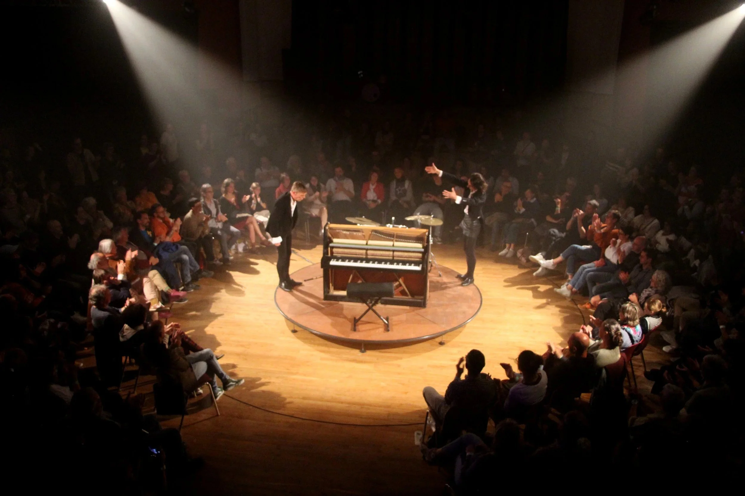 Dentro de la programación con 216 espectáculos en cuatro días, destaca la apuesta por los espectáculos de estreno. Tras los estrenos nacionales que se presentan hoy viernes, a cargo de la compañía brasileña y belga ‘Iara Gueller’ con ‘99 cm’ y de ‘Suso González’, de Castilla y León, con su nueva obra ‘Con alma de mujer’, durante el fin de semana se podrá disfrutar en Ávila de los estrenos absolutos en España de las compañías francesas ‘CIE.i.Si’ con su espectáculo ‘Le dernier concert’ con el que ofrecerá dos pases mañana sábado 30 de agosto, a las 13:00 y 18:30 horas, en el Palacio de Bracamonte. Un espectáculo que también se verá en El Barco de Ávila el domingo 31 a las 20:00 horas en el castillo; y ‘La Faux Populaire’ que presenta ‘Le Cabaret Renversé’ con tres pases, de viernes a domingo, en la carpa del Atrio de San Isidro, un espectáculo de circo-cabaret en pista circular con instrumentos musicales y objetos diversos.